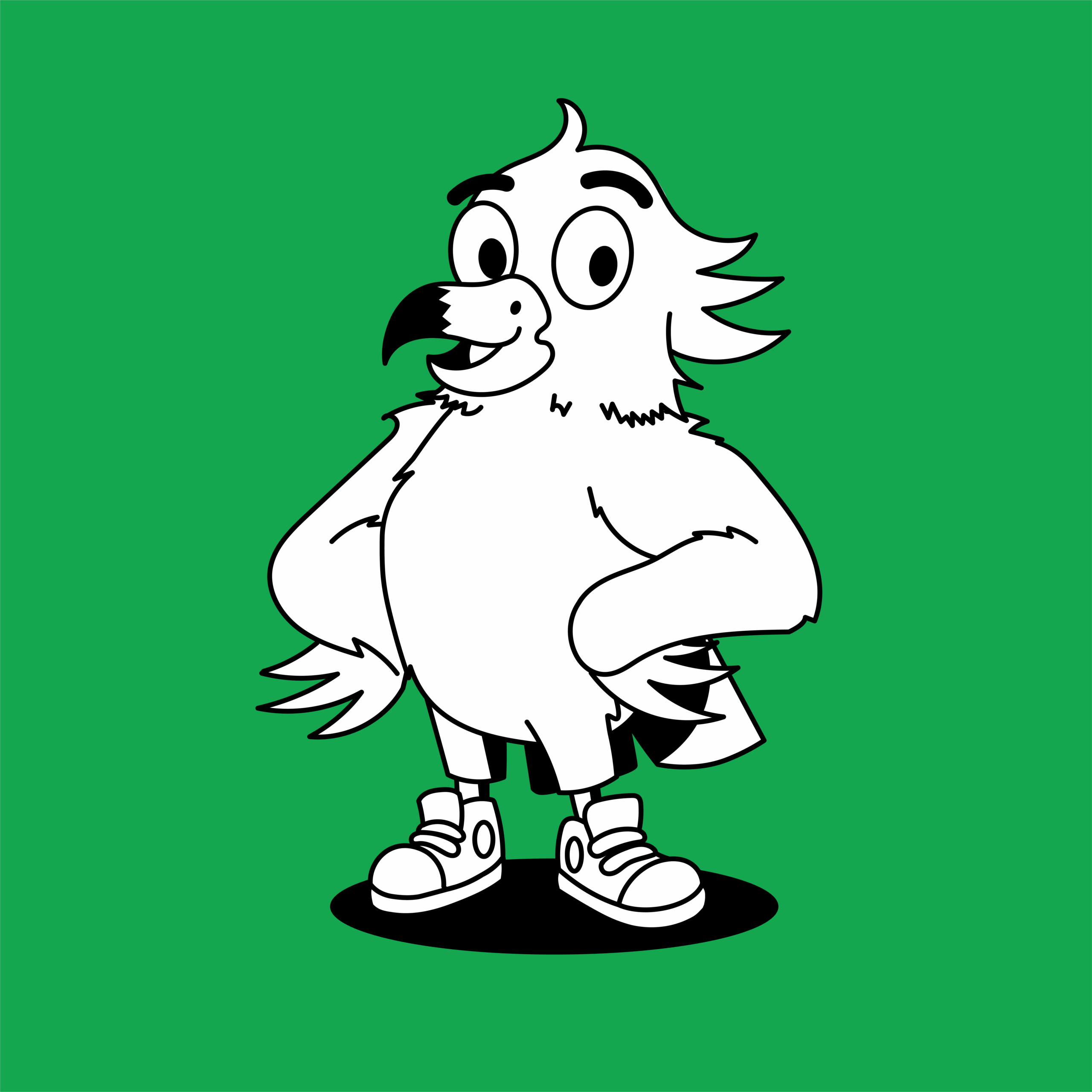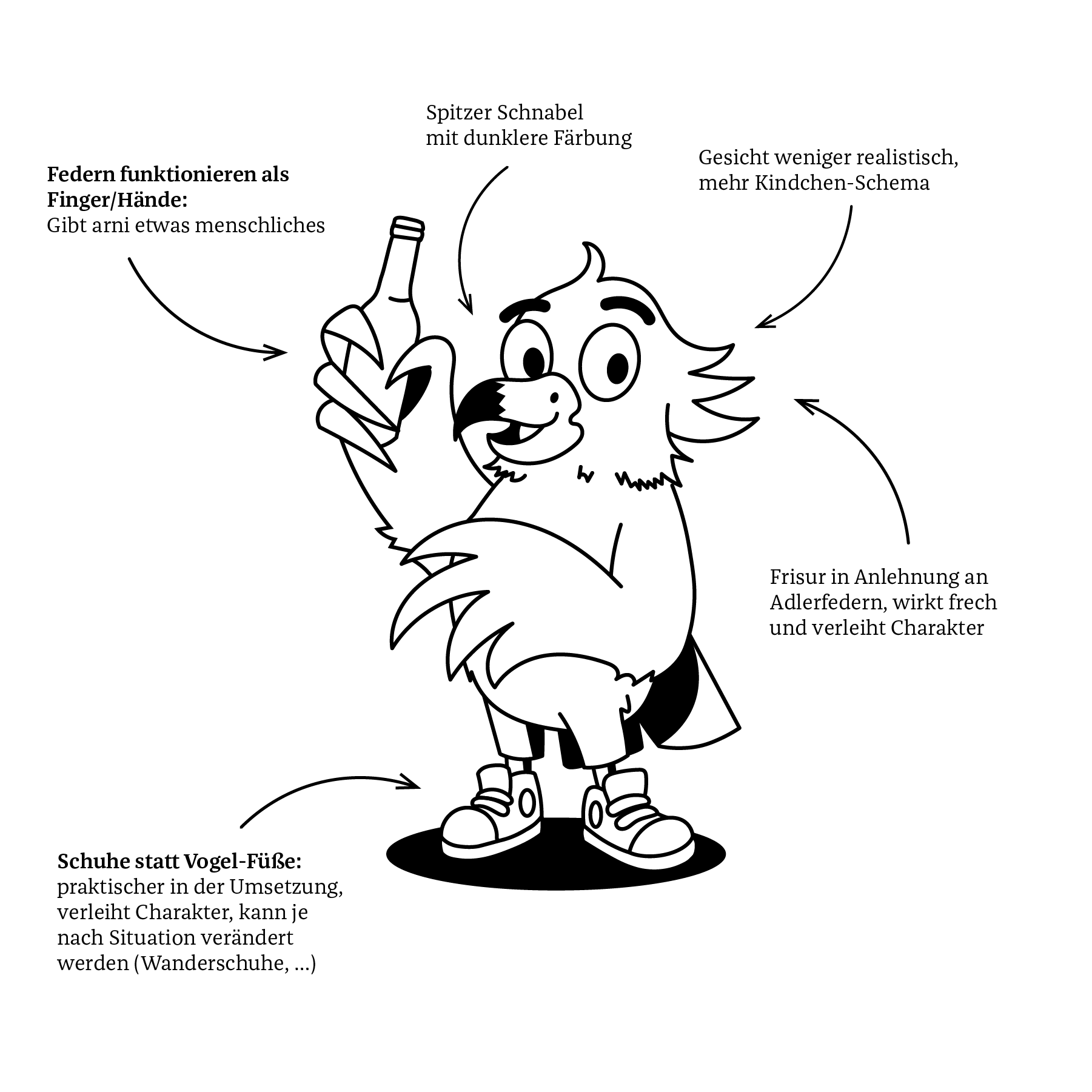 Nach zahlreicher Besprechung und Diskussion, welche Form arni annehmen sollte, kamen wir schließlich zum Ergebnis. Ein Vogel mit freundlicher und sportlicher Haltung, der aber auch menschliche Wesens­züge hat. Die Form des Vogels erscheint logisch, da das Wappen der Stadt bereits durch ein Adler geprägt ist. Die Symbolik, dass Alter Nester bauen, passte zu­sätzlich gut zur Begegnungsstätte. So wirkt er nahbar und loyal und wird so Teil der Gemeinschaft. Wir entgehen damit der Pro­blematik einer klaren Geschlechts­zuschreibung oder der Identifikation über Ethnie. Die Tatsache, dass er schwarz-weiß gehalten wird, lässt einiges zur Interpretation offen und kann so auch als Ausmal­bild für Kinder dienen: Jeder kann sich seinen arni malen, wie es ihm oder ihr am besten gefällt.