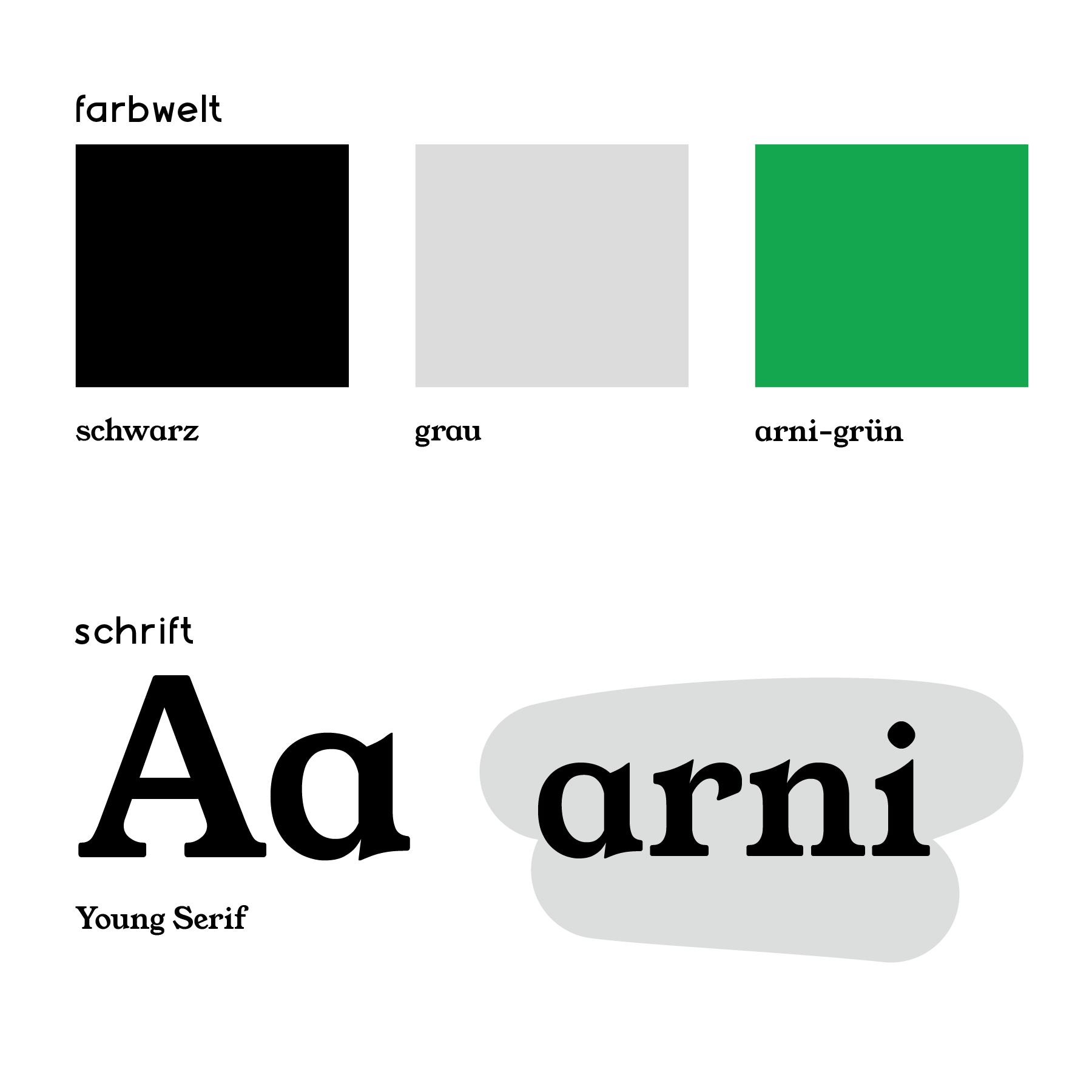 Neben Aussehen und Illustrationsstil von arni legten wir auch die visuellen Grund­lage für alle weiteren Medien fest: Farbwelt, Schrift und Layout. Als Marken­zeichen entschieden wir uns für die Wortmarke arni mit der Schrift „YoungSerif“ im boldem Schnitt. Sie repräsentiert durch ihre deutlichen Serifen Tradition, hat Ecken und Kanten und bringt durch ihre hohe x-Höhe eine gewisse Modernität und Digitalität mit. Die Farbe Grün haben wir vom Arnsteiner Wappen über­nommen und etwas digitaler und barriere­freier gestaltet. So bleibt die Identi­fikation mit der Farbe erhalten.