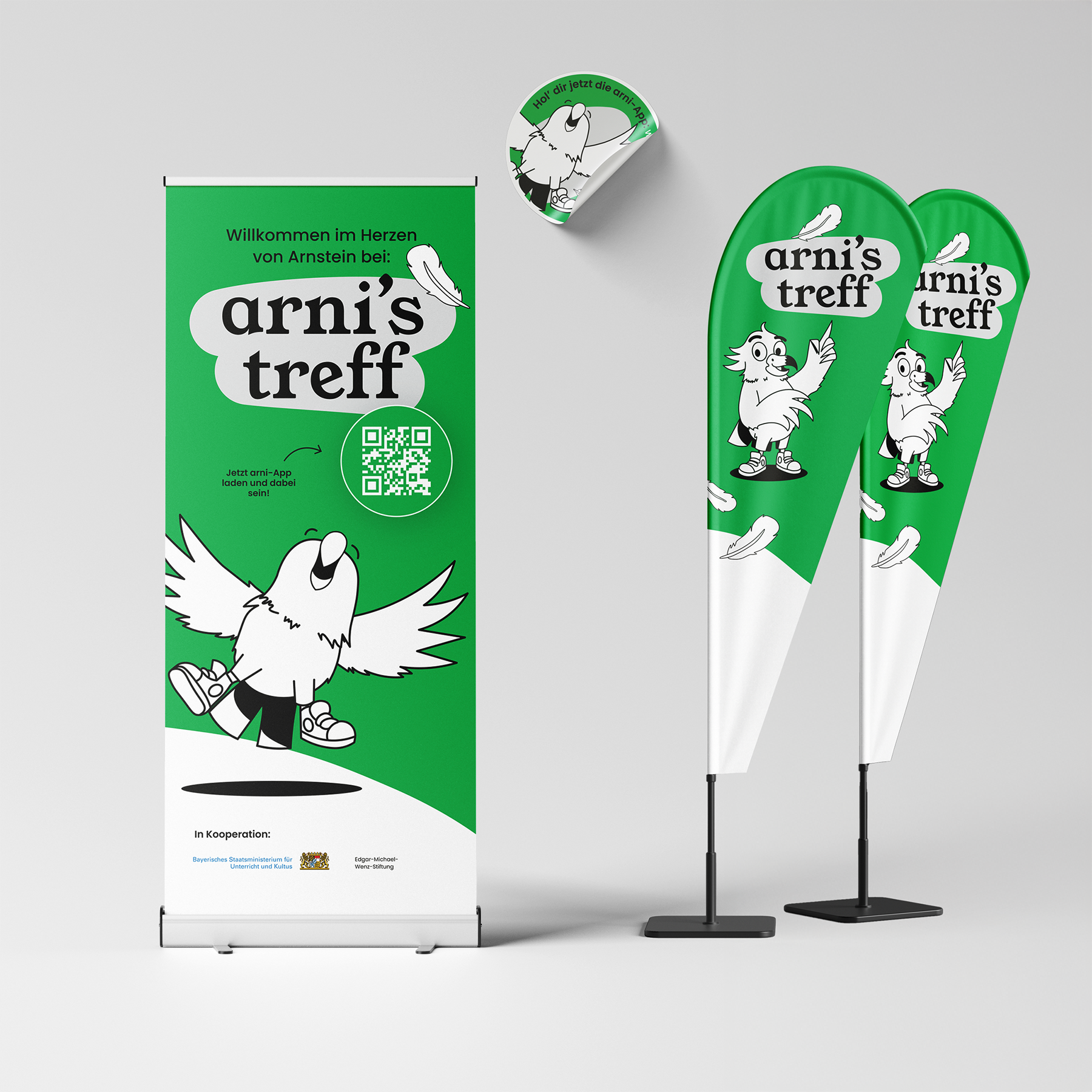 Zum Abschluss haben wir arni in verschiedenen Medien und Formaten sichtbar gemacht: Die Beachflags sorgen als fester Pfeiler vor der Begegnungsstätte schon von weitem dafür, dass die Leute den Raum finden. Die Sticker dürfen im Hausaufgaben­heft der Kinder oder auf dem Smartphone nicht fehlen. Und Web­header sorgen auf auf der Webseite von Arnstein dafür, dass arni bekannt wird.