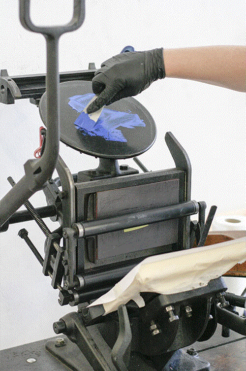 Zum Drucken braucht man Farbe. Um den Wert möglichst genau zu treffen, wurde die Buchdruckfarbe angemischt und getestet bis der Farbwert meinen Vorstellungen entsprach.Nun konnte mit dem Druck begonnen werden. Wobei, erst einmal musste die Maschine (ein)gerichtet werden, damit auch später der Druck an die richtige Stelle auf der vorgedruckten Karte kommen konnte. Also die Farbe auf die Maschine und dann: Testdrucken. Die ersten Drucke mussten Stück für Stück dem gewünschten Ergebnis angepasst werden. Dieser Vorgang dauerte ein wenig und bestand aus Drucken, Messen, Drucken, Messen, Drucken… usw.